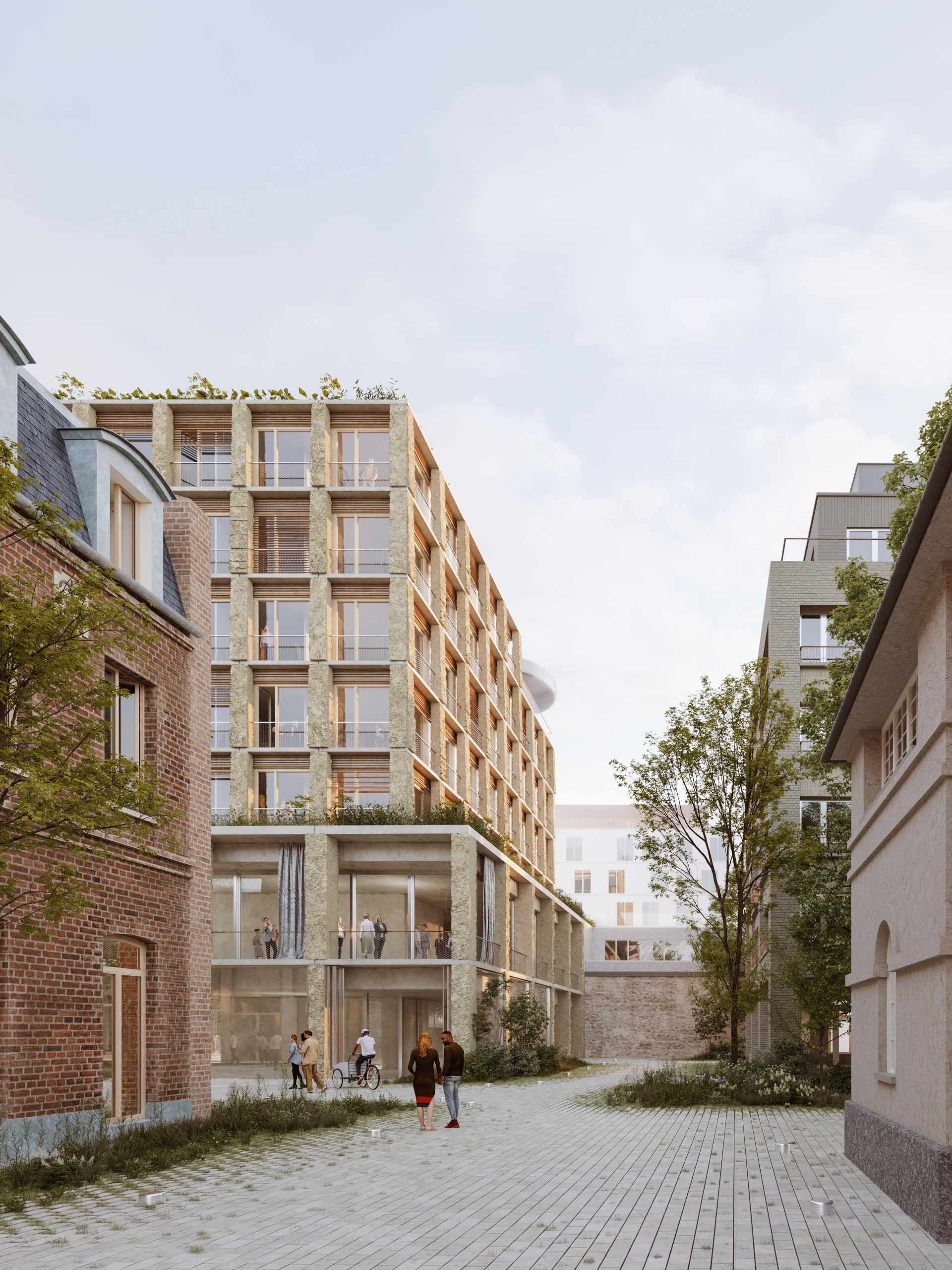 Conçu par Armand Nouvet Architecture, un bâtiment neuf sera érigé sur le lot Denfert dans un esprit d’harmonie avec le patrimoine existant et de frugalité : nous avons choisi de construire cette structure de pierre brute et de bois massif avec le moins de matière possible. Il développe ainsi une façade en pierre brute, qui marque l’entrée du site et fait écho aux autres projets du site Saint-Vincent-de-Paul, tout en s’intégrant harmonieusement au front urbain de l’avenue Denfert-Rochereau. Les rez-de-chaussée et 1er étage accueilleront respectivement un espace d’exposition et une salle de concert, des logements aux étages supérieurs prolongés de loggias sur rue, ou de balcons autour du jardin suspendu en couverture de la salle de concert. Le bâtiment est couronné d’une toiture jardin accessible aux habitants, offrant une vue panoramique sur les jardins de l’Observatoire.