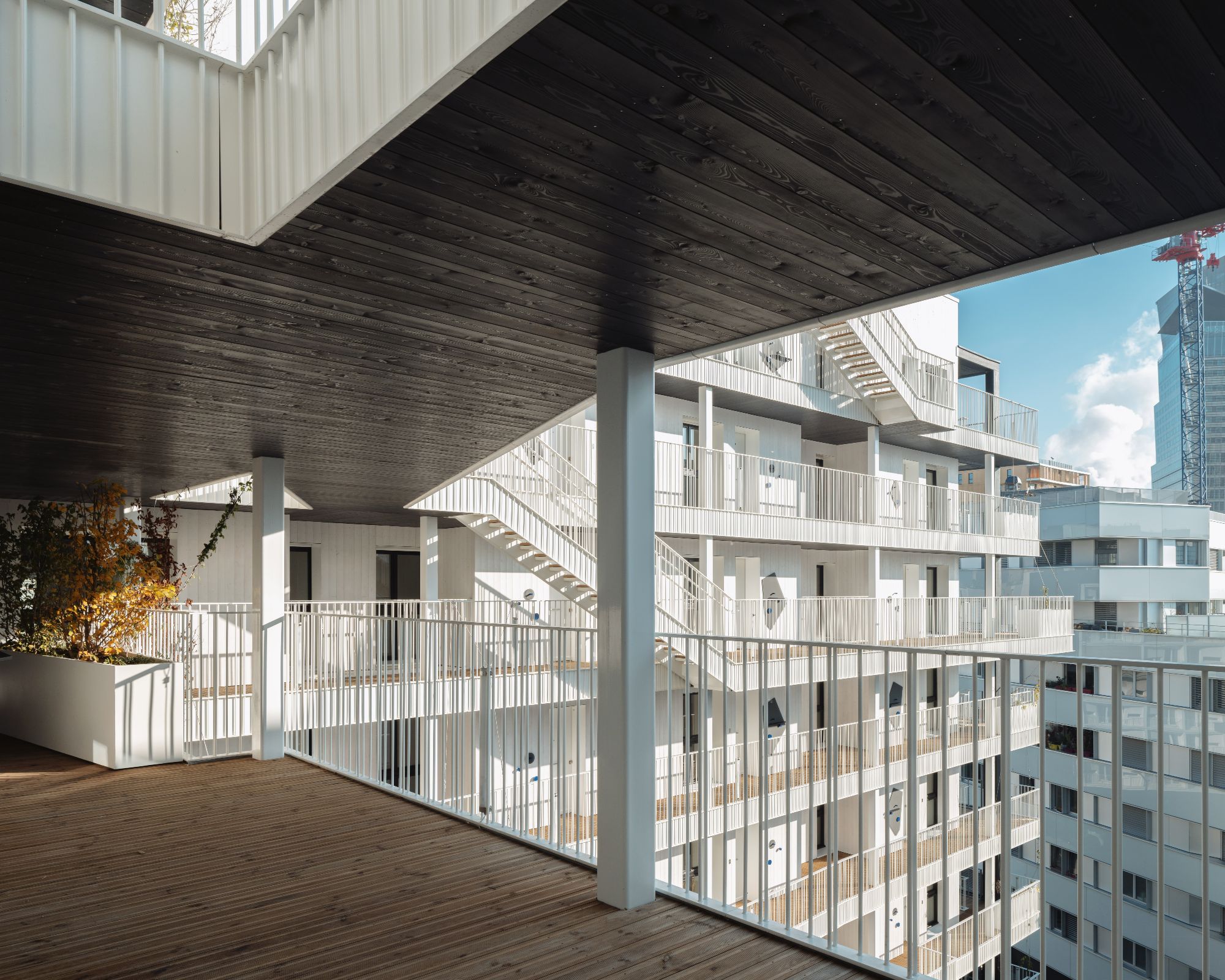 Pour contrer ce biais, et redonner aux habitants une vraie maîtrise de leur identité comme de la communication autour de celle-ci, une attention particulière a été portée aux espaces intermédiaires, lieux de rencontre par excellence. L’immeuble NEW G a été conçu comme un village vertical centré sur le commun, et où le commun est incarné dans tous les espaces collectifs reliant le domicile et la ville : les escaliers ont été élargis, et les couloirs remplacés par des coursives ouvertes sur l’extérieur et inondées de lumière naturelle. Celles-ci traversent le volume central, comme autant de rues à ciel ouvert. Trait d’union entre les habitants, un pont habité surplombe le cœur d'îlot : espace de détente et de convivialité, c’est un lieu de rencontre ou de rendez-vous pour certains, de lecture ou de contemplation pour d’autres.