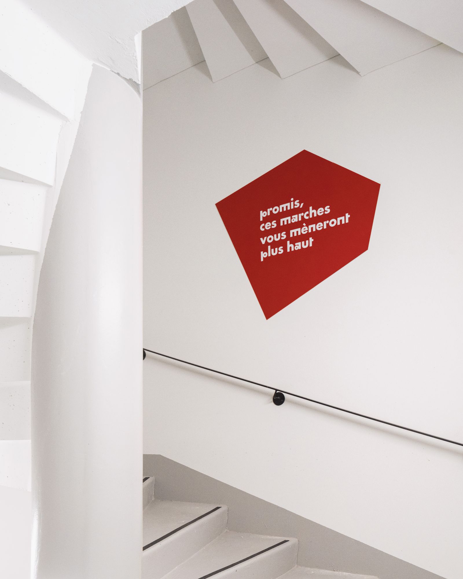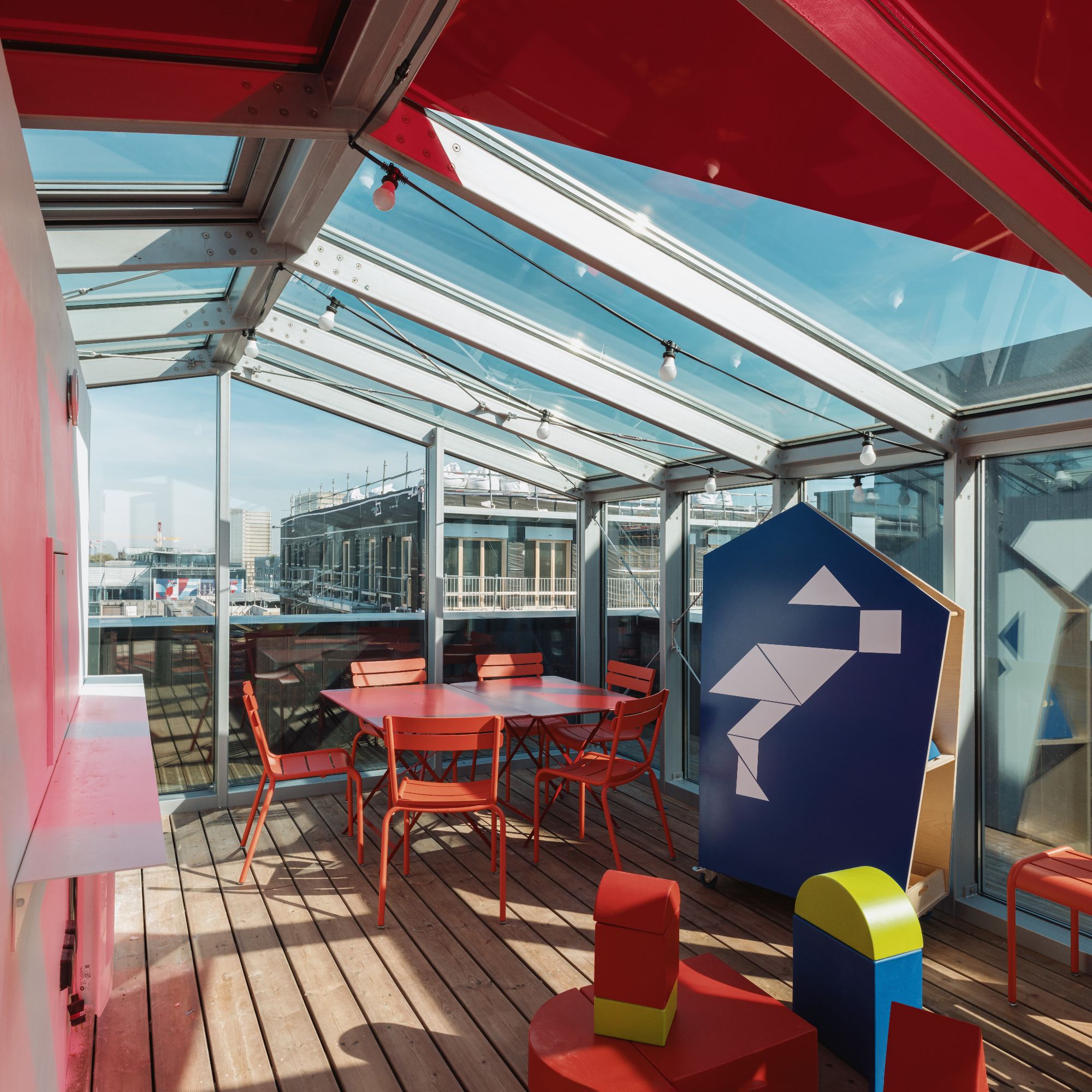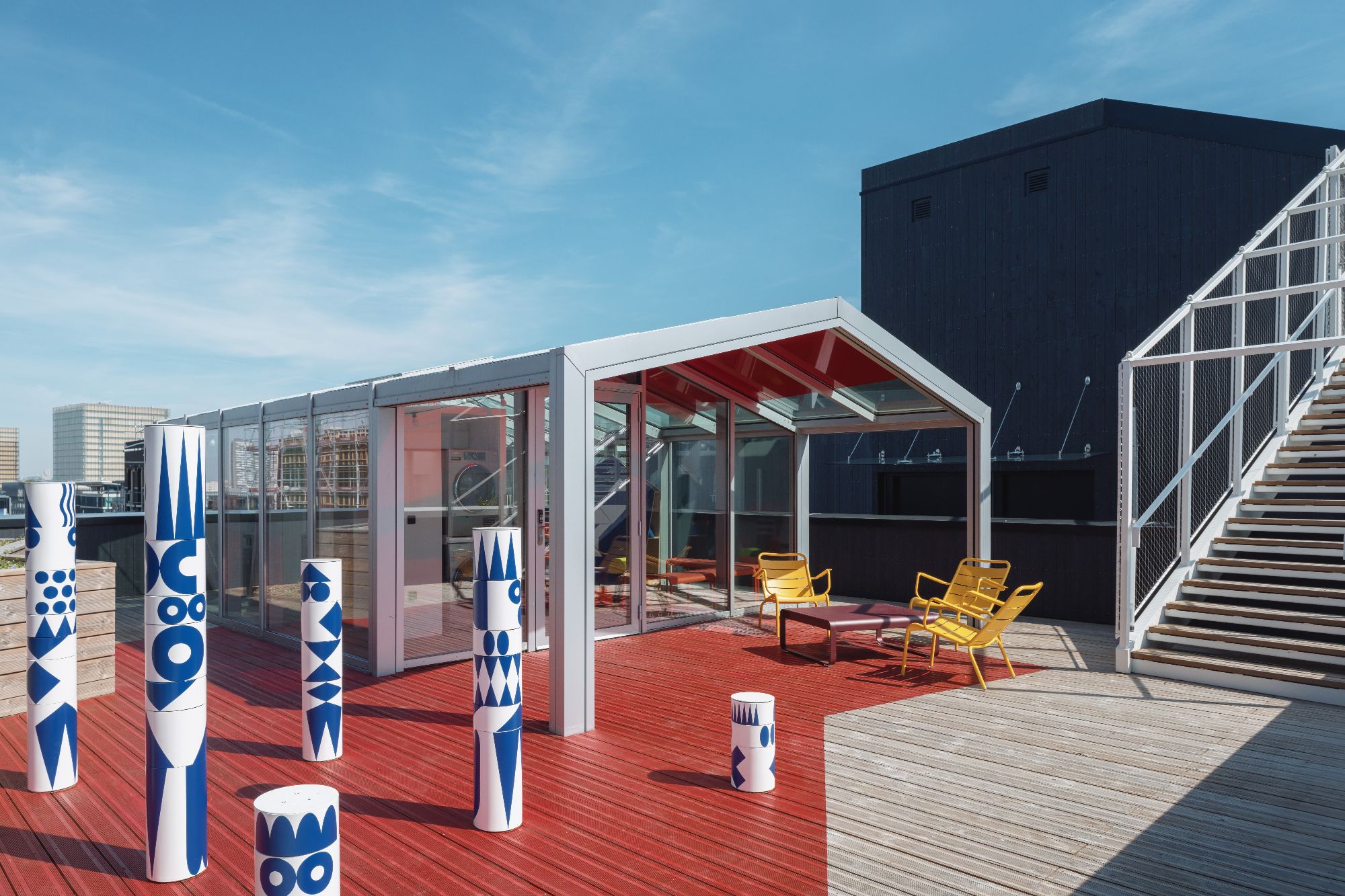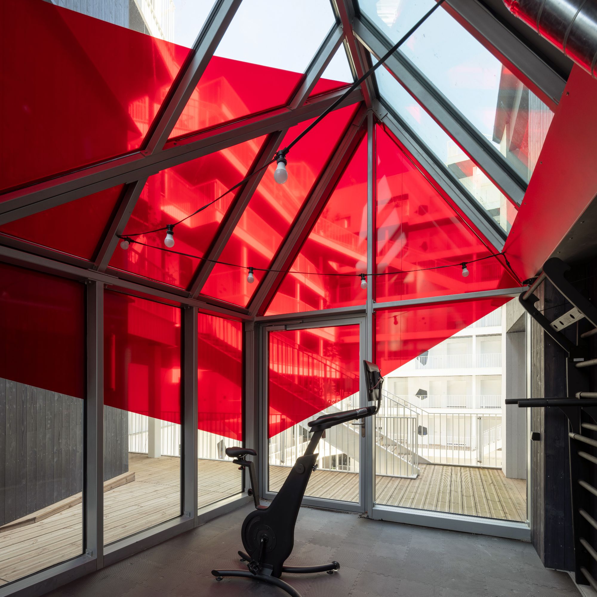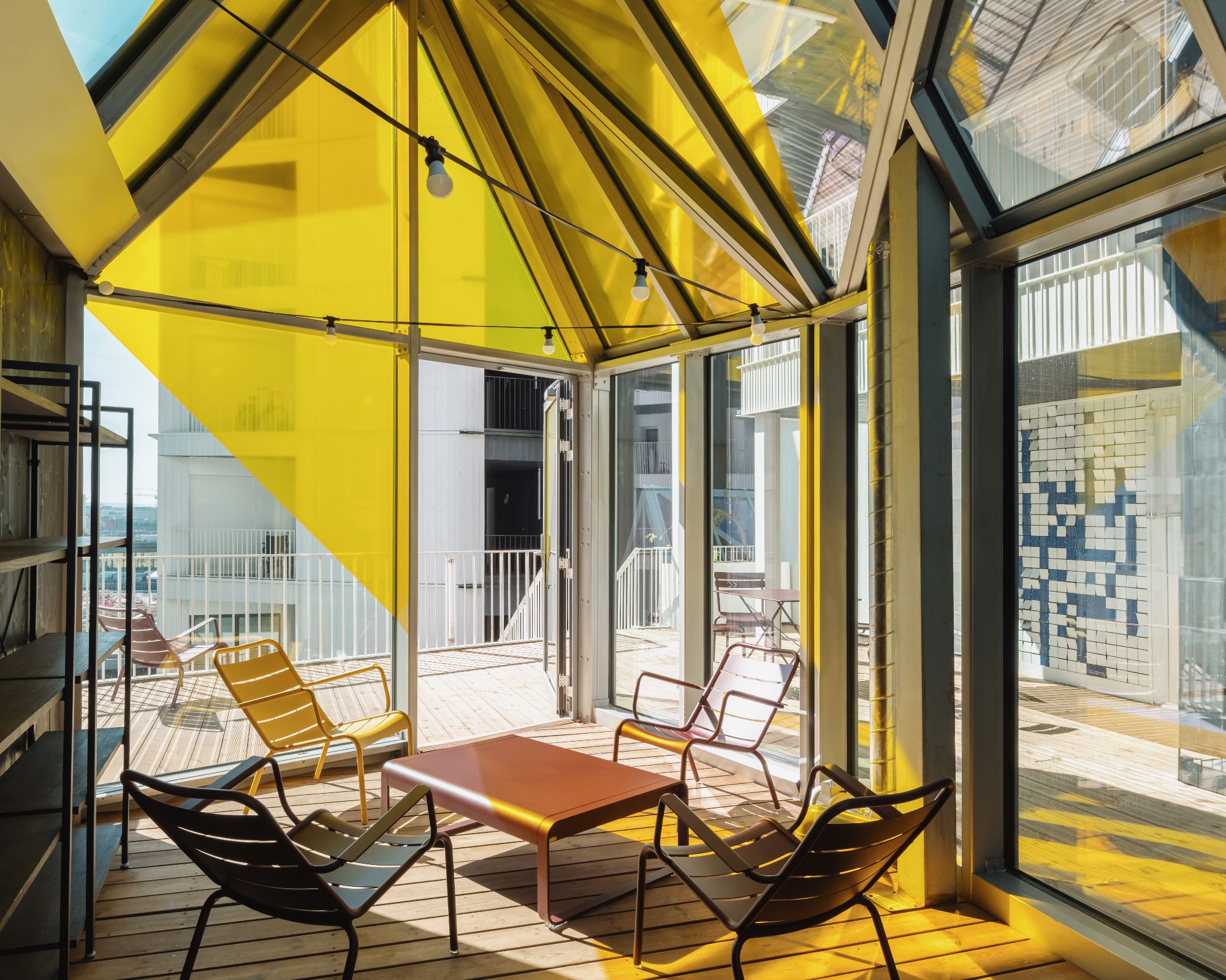 Pour faciliter l’appropriation des lieux, le graphiste et plasticien Malte Martin a créé une signalétique avec des couleurs mettant en évidence les usages : le rouge correspond aux zones dynamiques, le jaune pour la convivialité, etc. “New G est une occasion de repenser la relation entre la sphère privée et l’espace partagé”, explique Malte Martin. D’ailleurs, certains espaces partagés sont réservables : la cuisine du roof top, le jardin d’hiver et la salle de sport, par exemple, peuvent se réserver à l’aide de son téléphone, puis on y accède grâce à une serrure intelligente.