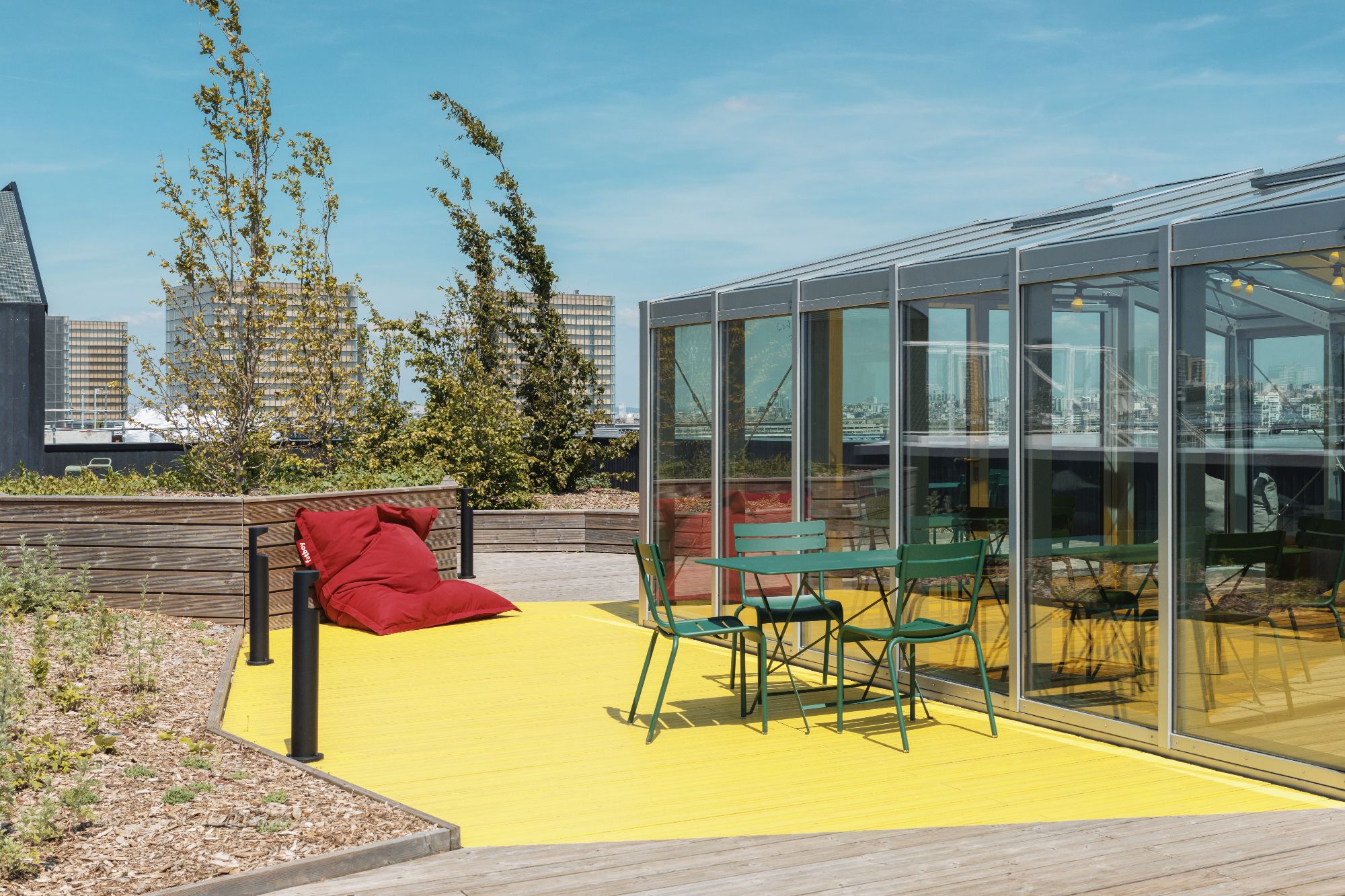 Pour faciliter l’appropriation des lieux, le graphiste et plasticien Malte Martin a créé une signalétique avec des couleurs mettant en évidence les usages : le rouge correspond aux zones dynamiques, le jaune pour la convivialité, etc. “New G est une occasion de repenser la relation entre la sphère privée et l’espace partagé”, explique Malte Martin. D’ailleurs, certains espaces partagés sont réservables : la cuisine du roof top, le jardin d’hiver et la salle de sport, par exemple, peuvent se réserver à l’aide de son téléphone, puis on y accède grâce à une serrure intelligente.
