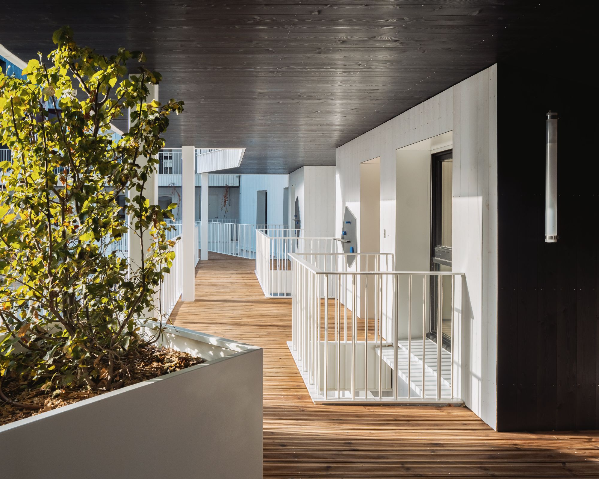 Pour aider les habitants à nouer des relations choisies avec leurs voisins, l’entrée de chaque appartement est personnalisable : une ardoise pour y écrire un mot ou un dessin, un rack à vélo, une table basse sur laquelle déposer livres et magazines dont on ne veut plus… tout est bon pour multiplier les points de contact. Et si cela ne suffit pas, un système a été conçu pour créer des prétextes à conversations : un mur de pixel qui permet de composer des messages pour ses voisins.